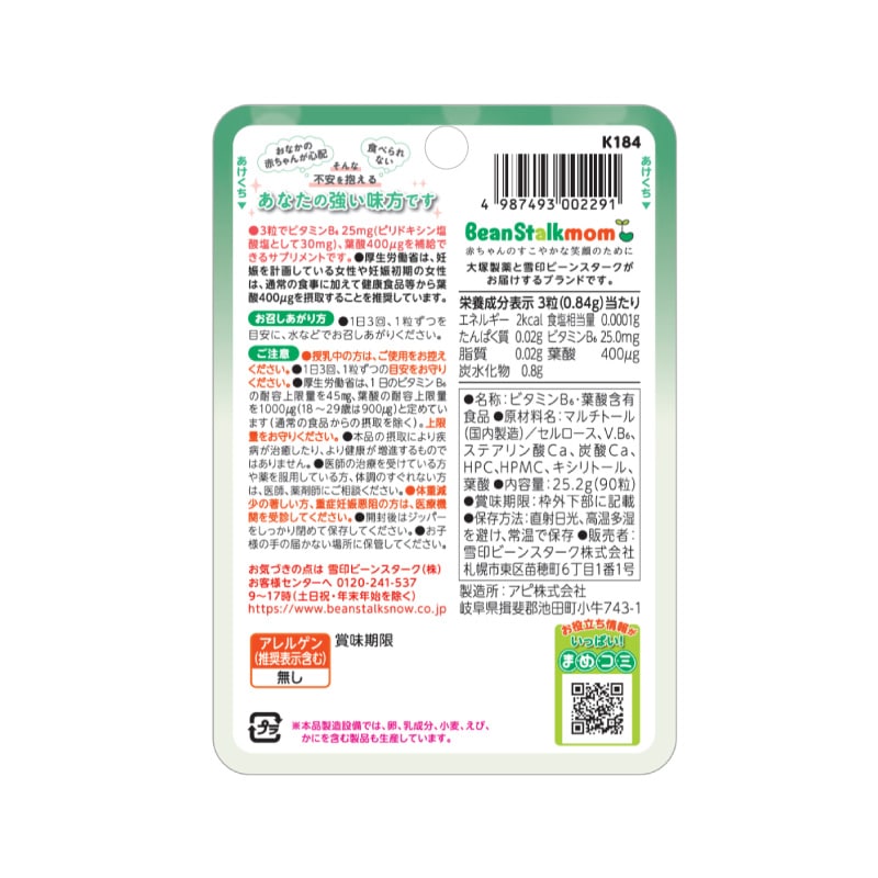 ●熱量・栄養成分/3粒(0.84g)あたり エネルギー2kcal、たんぱく質0.02g、脂質0.02g、炭水化物0.8g、食塩相当量0.0001g、ビタミンB6 25.0mg、葉酸 400μg