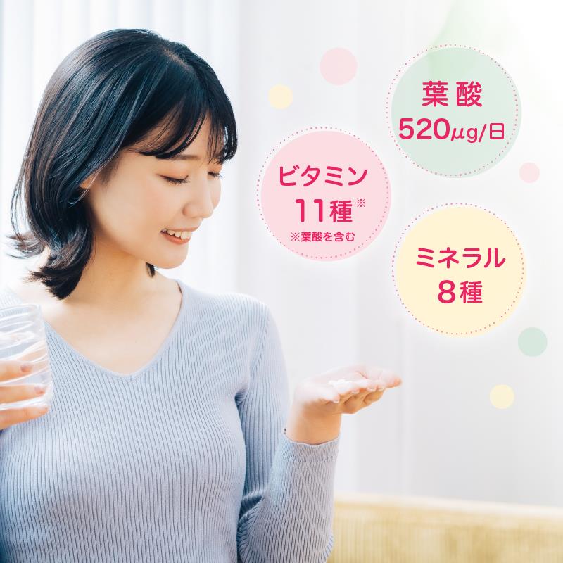 葉酸520㎍/日に加え、日本人の食事摂取基準などを参考に、妊娠前から妊娠期に大切な11種のビタミン(葉酸を含む)、8種のミネラルを配合しています。